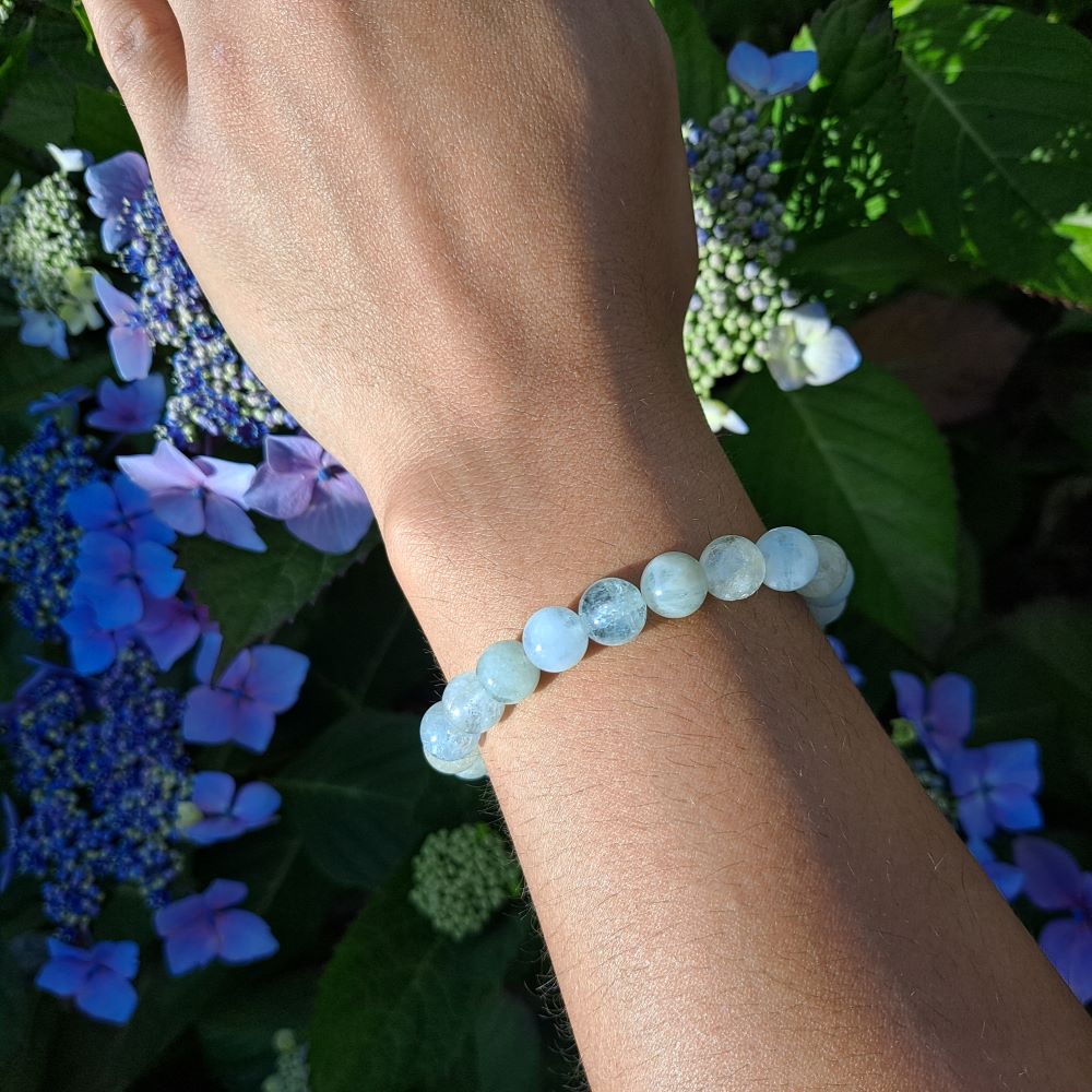 This exquisite handmade bracelet is crafted from natural aquamarine beads, with each 8mm gemstone bringing encouraged healing energies to the wearer. Treat yourself to this luxurious accessory, ideal for special occasions or daily wear.