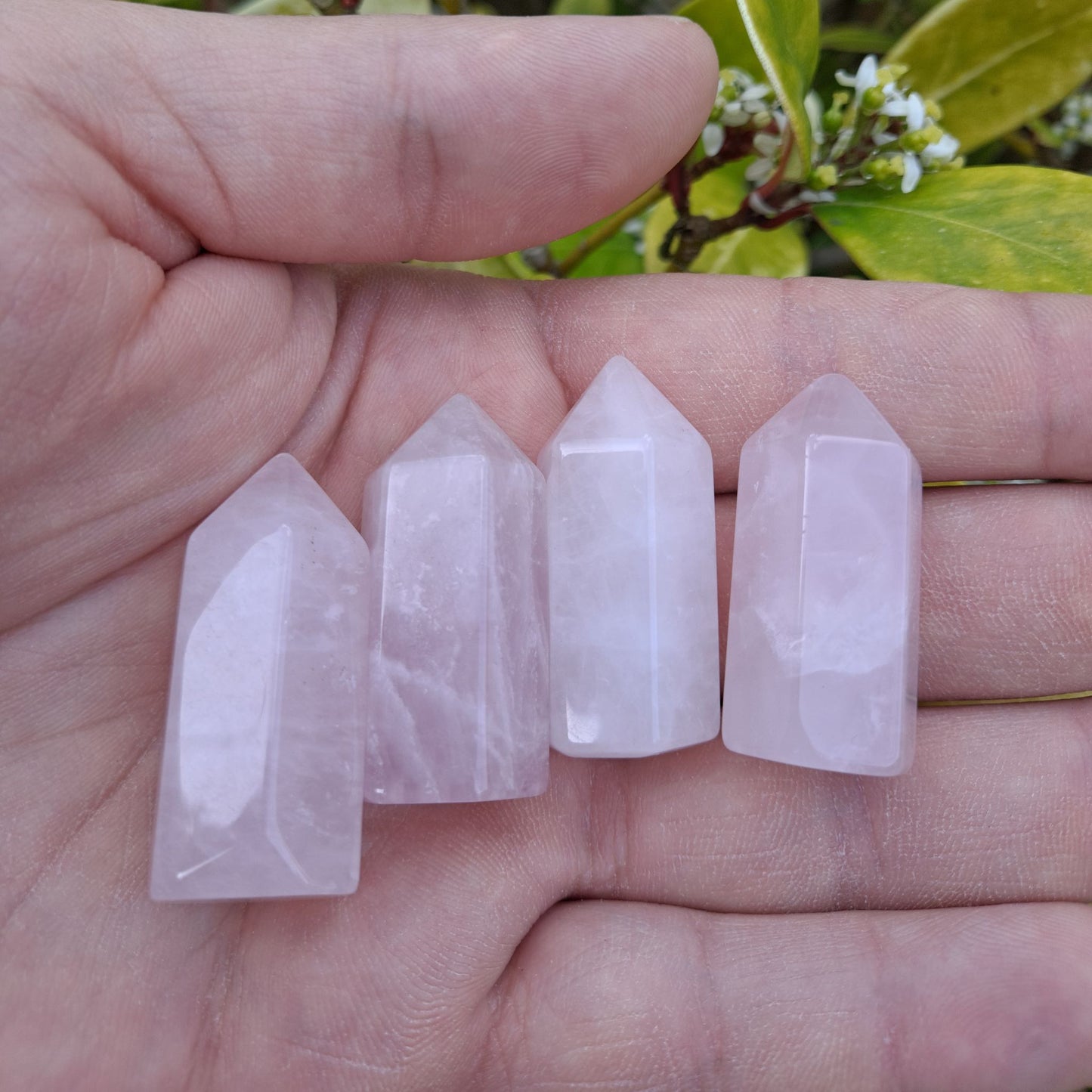 Each tower is made from natural Rose Quartz, so colour and pattern may vary slightly. Listing is for one (1) mini tower.